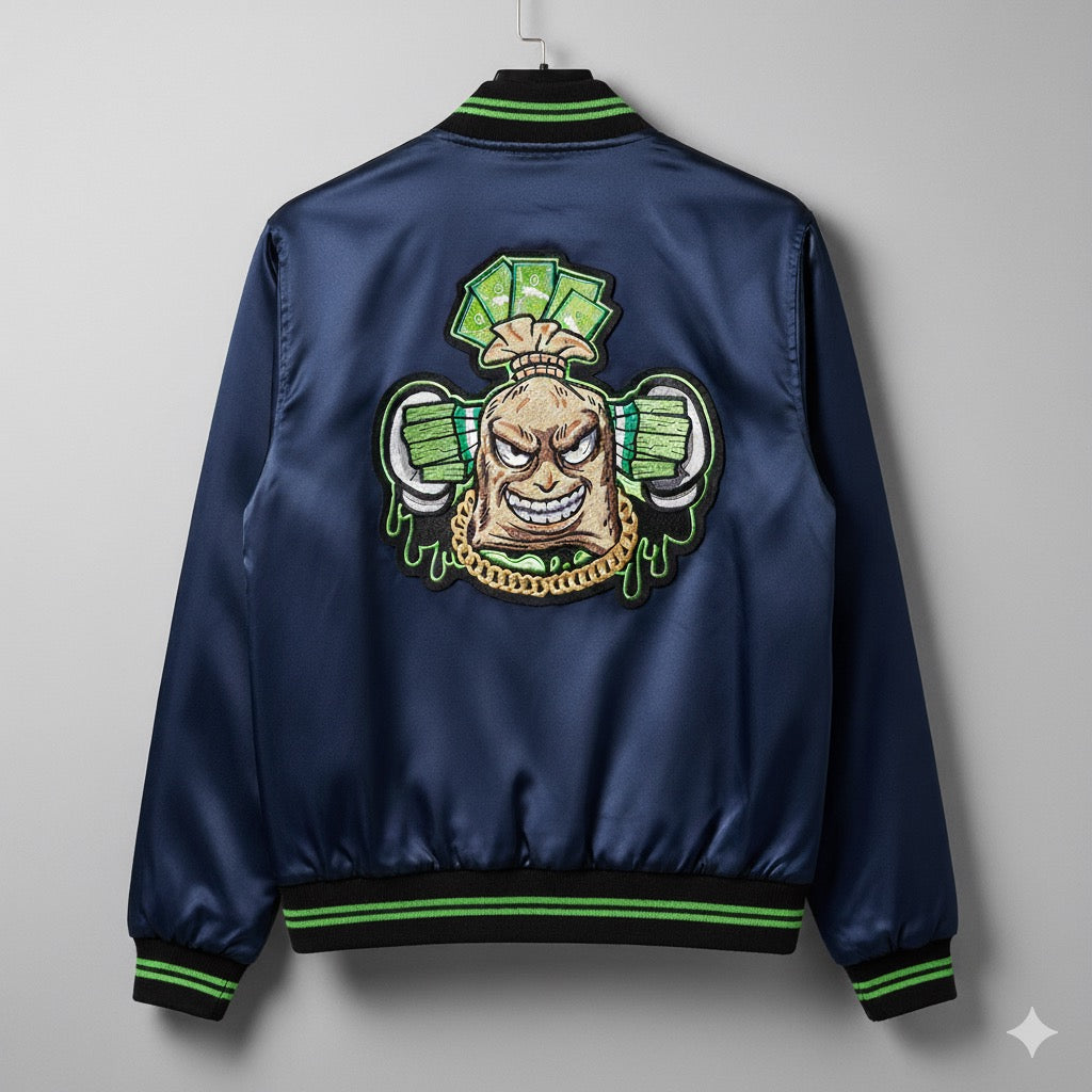 Chenille and embroidery money bag back patch for letterman jackets, denim or leather vests. Make your statement with this 11.5" wide x 12.0" tall chenille with extensive embroidery combination patch.