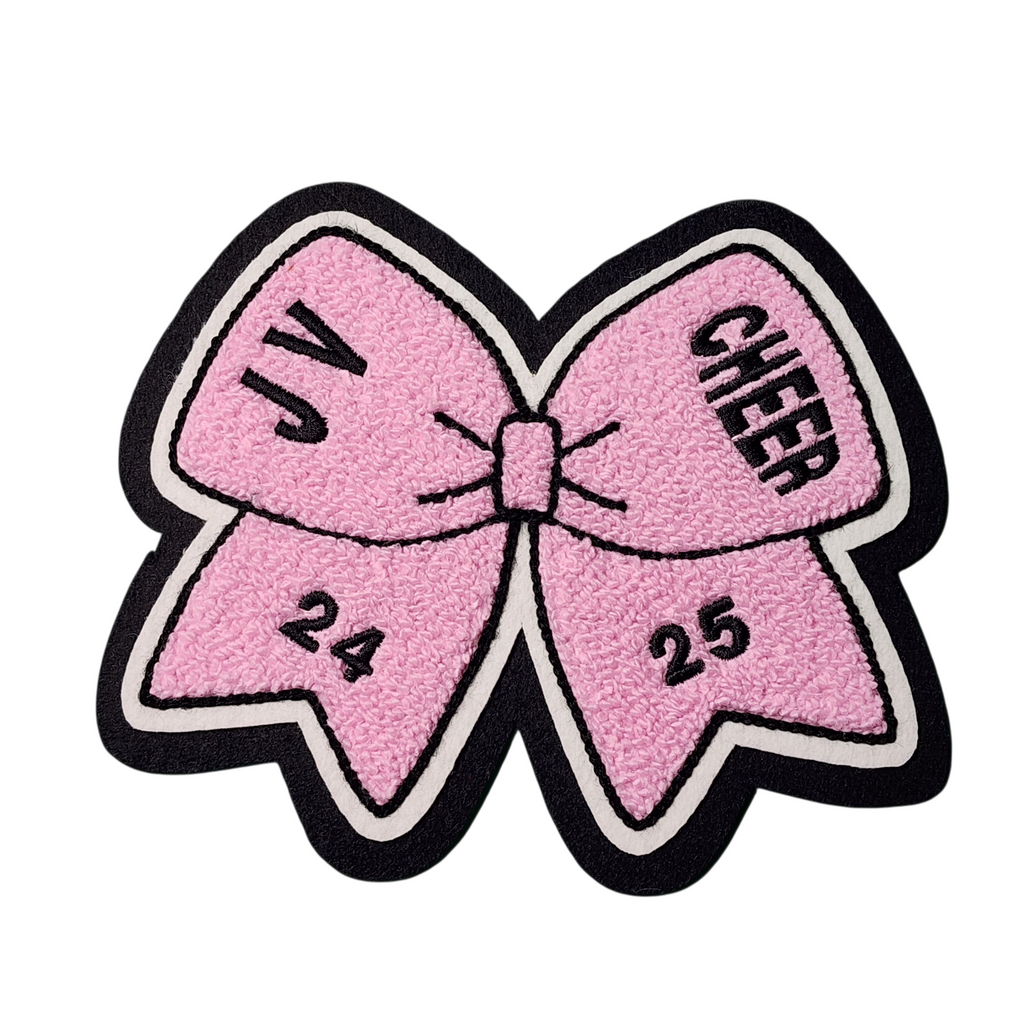 Cheerleader bows come in all sizes and shapes. This design overall dimension is 6.625" wide by 5.25" tall. Designed as a sleeve patch, this patch can be placed anywhere on the jacket. Colors and lettering can be changed to meet your specific needs since each piece is custom made to your order.
