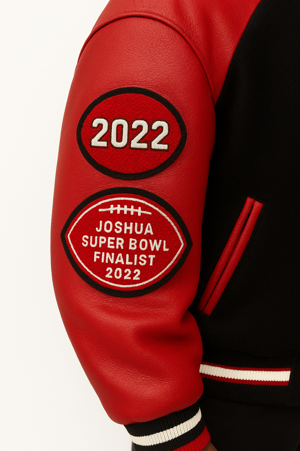 Our custom made chenille letterman jacket football patch P10041 will have your team members turning heads on the gridiron. Crafted with high school sports athletes in mind, this luxurious sports jacket patch is the perfect way to bestow special recognition to deserving players. Add names, numbers, position, division, Etc, as needed. All lettering available in block or script. Our 4" letterman jacket or sweater patch will create a lasting impression.
