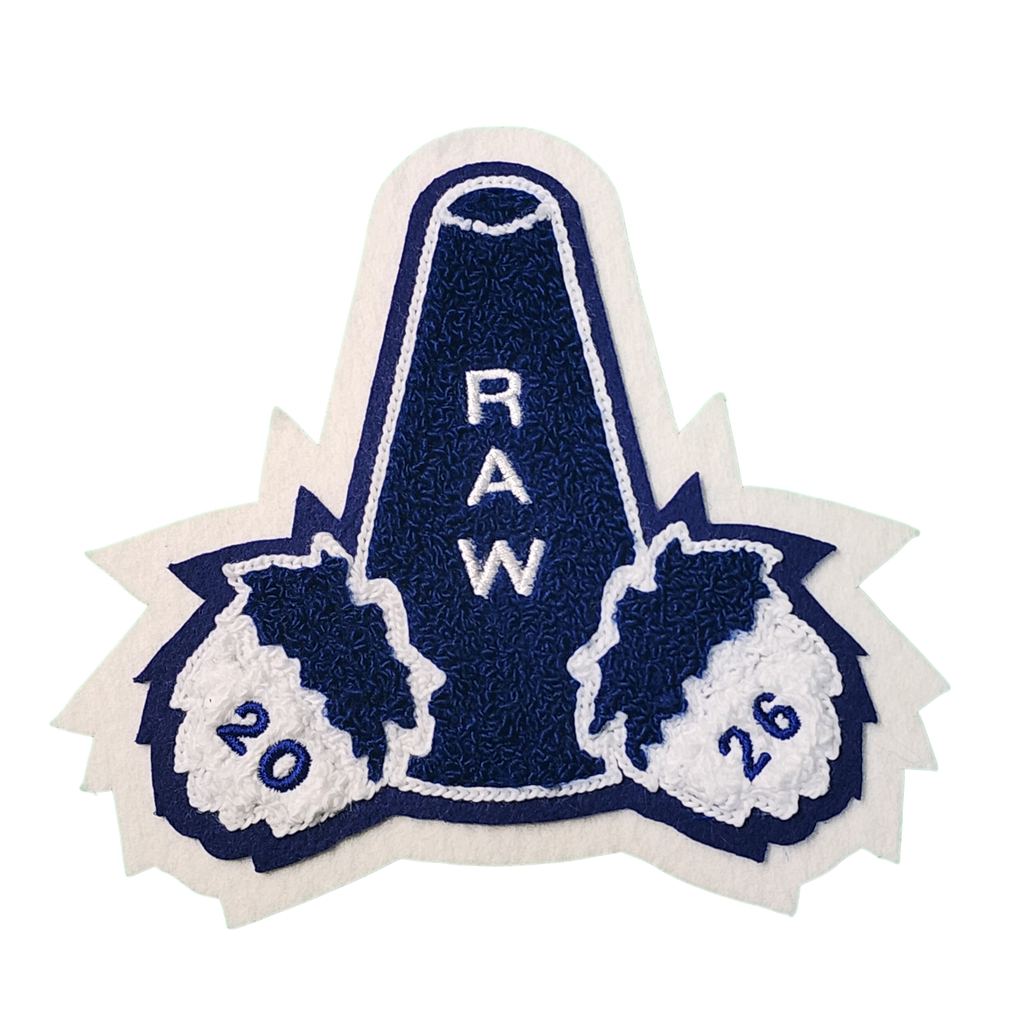 This item is custom made so both the lettering and dates may be changed to meet your specific requirements. On this patch, the year dates are sewn on top of the chenille and within the megaphone, the chenille is sewn around the lettering although it too can be sewn on top of the chenille if desired.