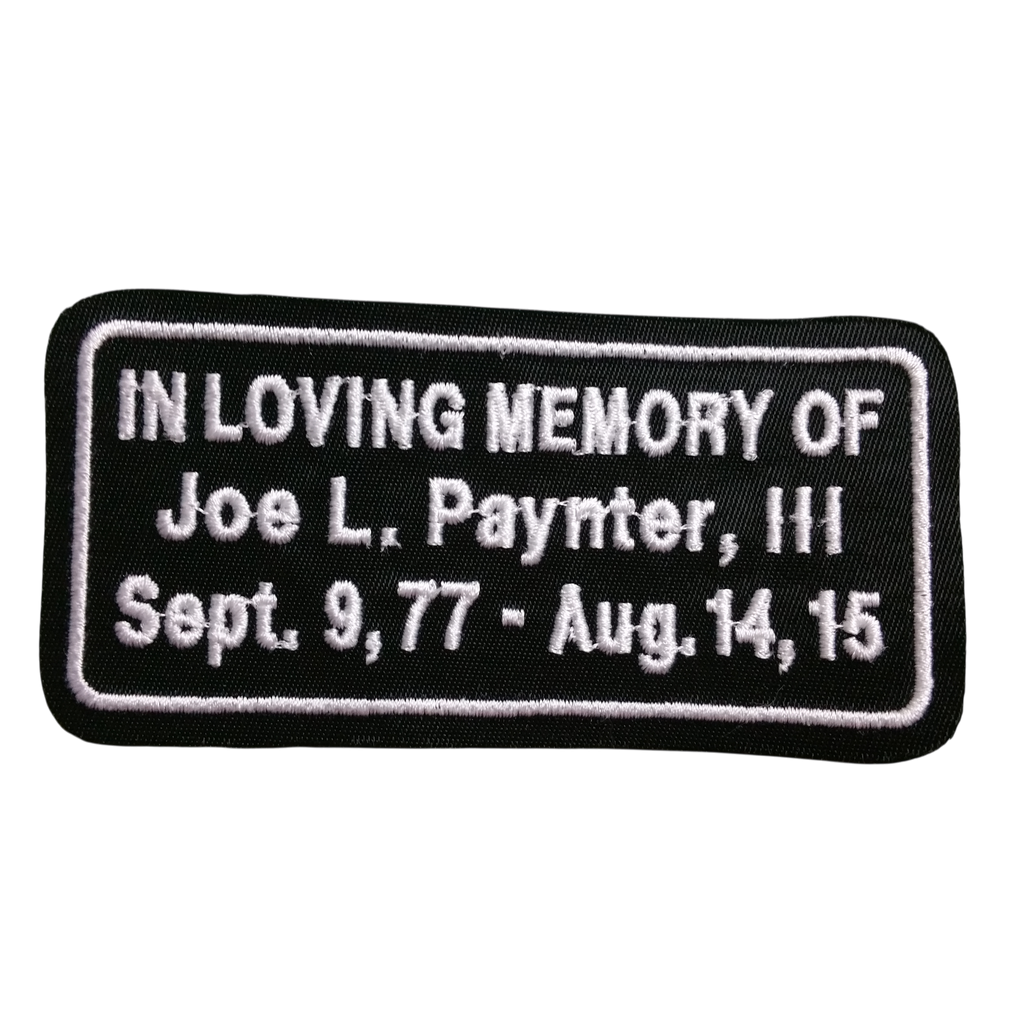 Arches can be sized to best fit both the motorcycle vest, their placement, and the size arch required. Generally, we try to create a one-size-fits-all patch for these arches so that everybody looks alike. Arches can be up to 13" long - left to right and usually have 2 to 3 inch black lettering.